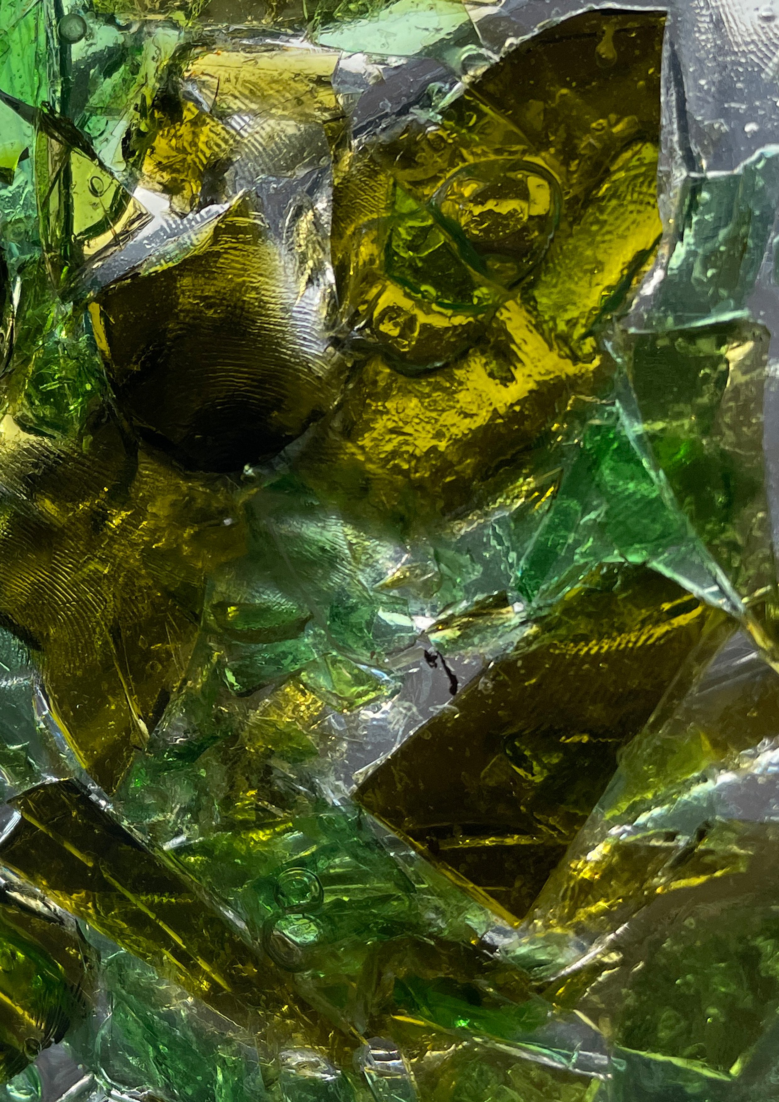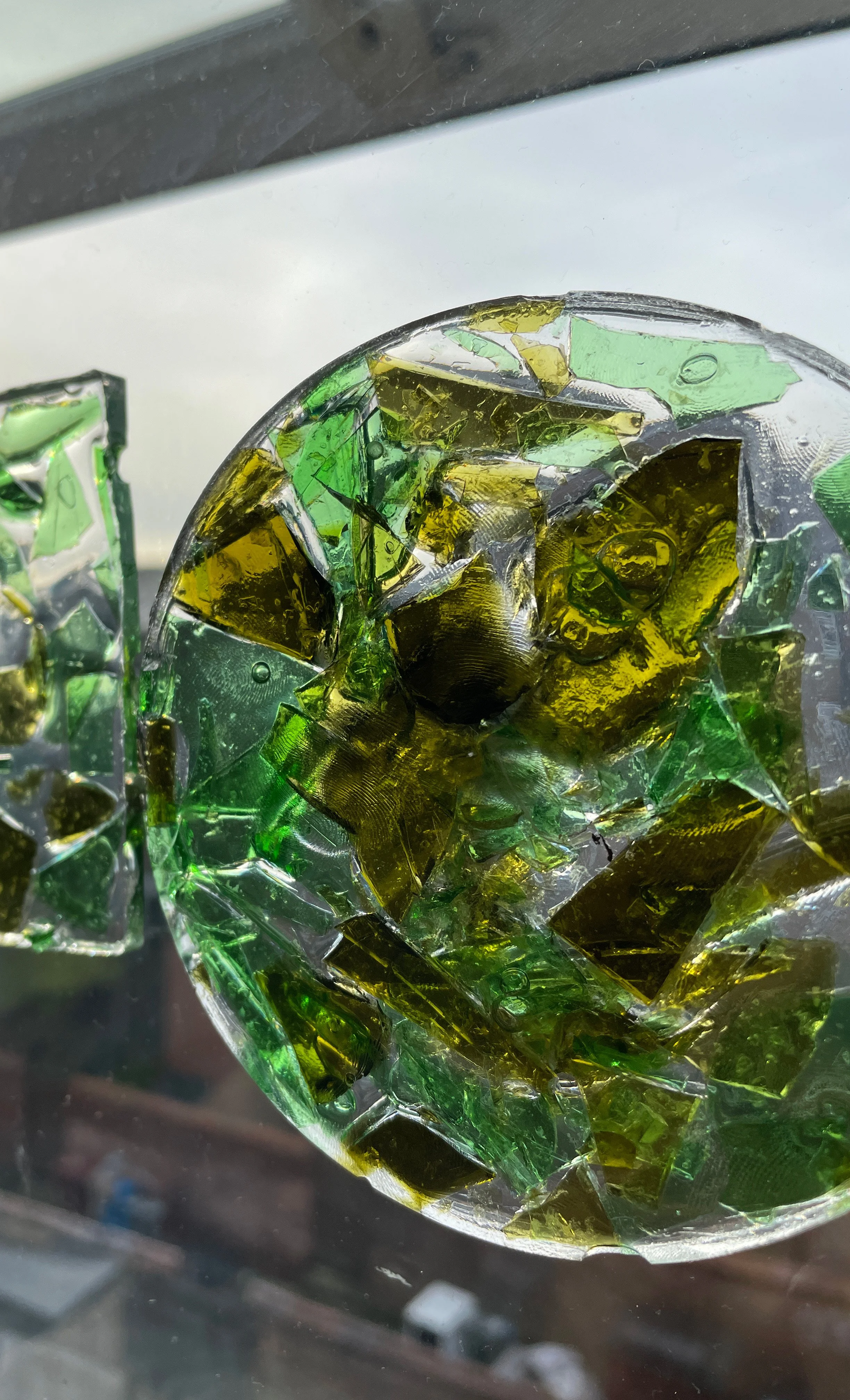 Each piece of glass carries subtle variations in tone and texture, aiming to display the beauty in everyday waste.