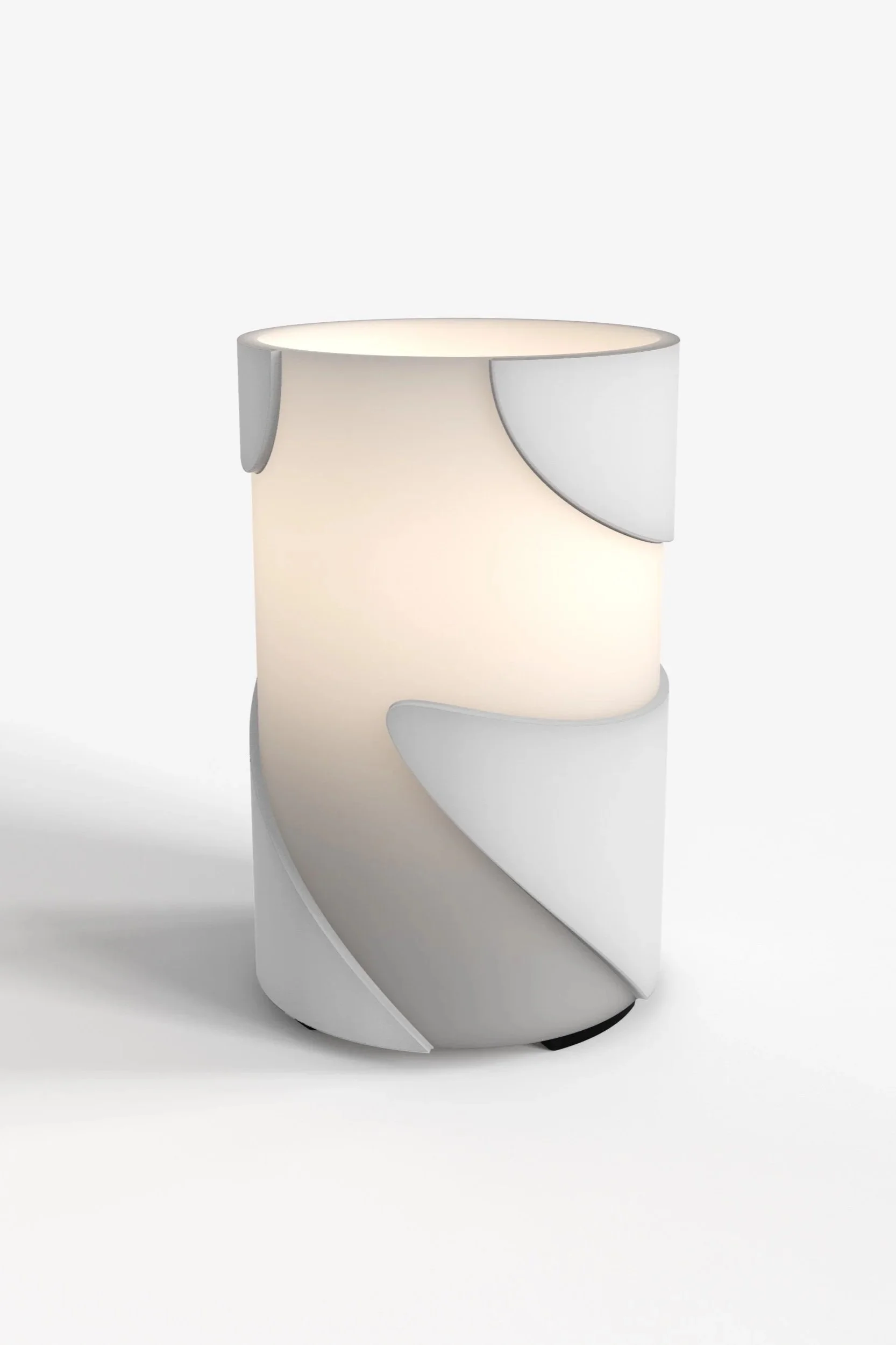 Made from translucent porcelain, the piece takes its name from the fluid, wave-like contours that wrap around its cylindrical body. These curves serve a decorative and functional purpose. They are utilised to diffuse the internal light, creating a soft interplay of brightness and shadow that shifts as one moves around it.
